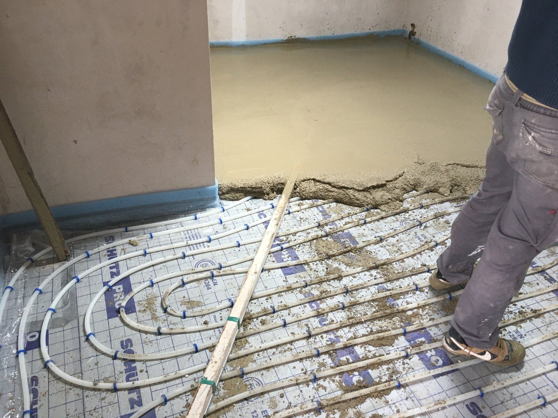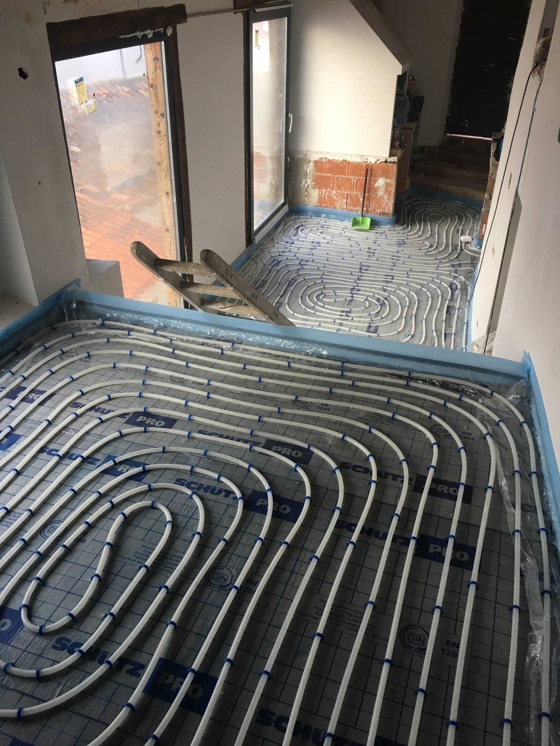 Se ha instalado en toda la casa suelo radiante/refrescante. Con ello conseguidos 2 cosas, por una parte y mas importante un confort sin igual, ya que no tenemos zonas mas o frías o calientes que otras, evitamos chorros de aire y conseguimos un ambiente acogedor. Por otra parte eliminamos maquinas de aire, radiadores y otros elementos que en muchos casos estorban en las diferentes zonas.